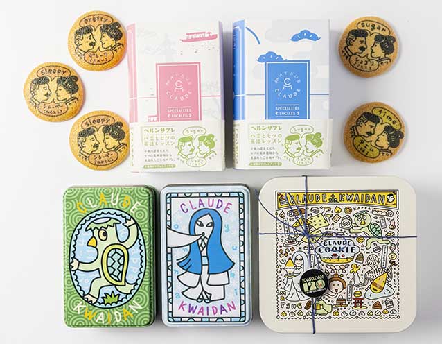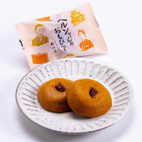 八雲とセツの英語レッスンをイメージしたお菓子です。セツは八雲の日本語理解や執筆を支えるために「英単語帳」を作り、聴き取った音を出雲なまりの日本語で記録しました。5つの単語をサブレにしました。セツの「英単語帳」から生まれた『ヘルンサブレ』