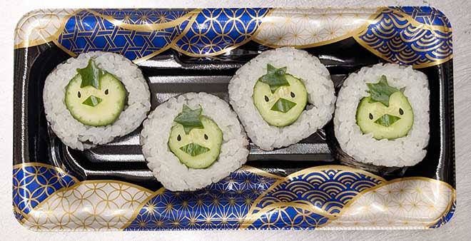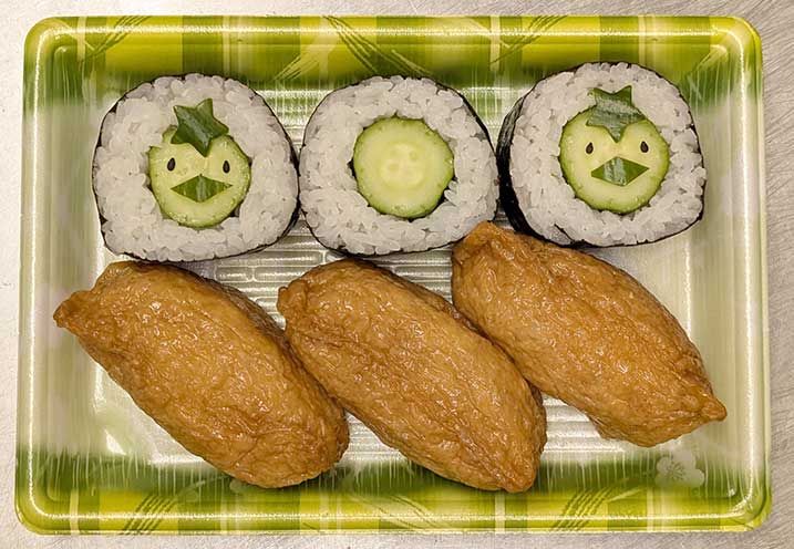 河童は八雲の著書には登場しませんが、日本の象徴的な妖怪としての河童のかっぱ巻きと、八雲がよく散歩に訪れた城山稲荷神社境内の石狐を好んでいたことから、キツネの好物いなり寿司を合わせて助六寿司にしました。 -