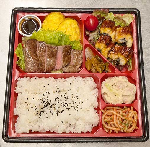 小泉八雲の好物だったと言われているビフテキ、鰻、オムレツと、小泉八雲が幼少期を過ごしたアイルランドの家庭料理「コルカノン」(アイルランド風ポテトサラダ)をお弁当にしました。 -