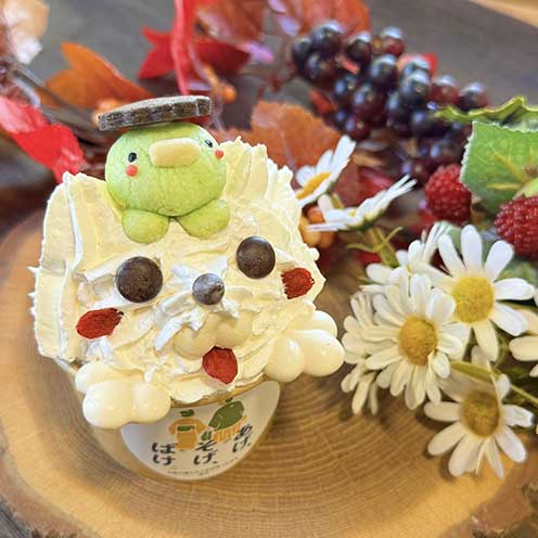 小泉八雲と“縁(ゆかり)”があるカッパモチーフを人気の【堀川わんわんソフトクリーム】と一緒に!頭に乗ったカッパくんと一緒にこちらを見つめる堀川ワンコがとっても可愛いです!ぜひ写真に撮って遊んでください。