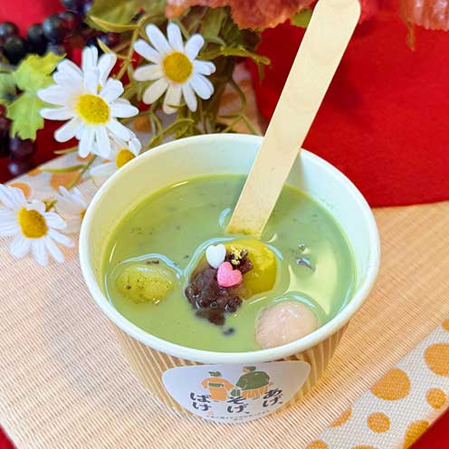 牛乳が好きだった小泉八雲と松江出身のセツを抹茶に見立てた松江が繋いだご縁のぜんざいです。寄り添う2人に思いを馳せつつ、松江“縁(ゆかり)”のぜんざいをぜひお召し上がりください。抹茶のほろにがさをミルクと小豆でまろやかに包みほっとする味に仕上げました。ハートと金箔で八雲とセツの“ご縁”を表現しています。 -