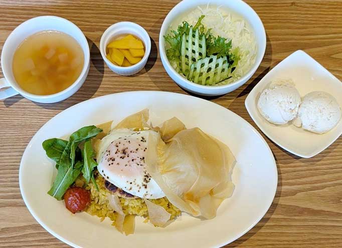 Hearnバーグライス・スープ・サラダ・副菜・アイスからなるランチには八雲の言う“日本料理の根本”にある米、豆や野菜をたっぷり使い、八雲の好物の目玉焼きや八雲が愛した帽子(食べられます)も加えました。 -