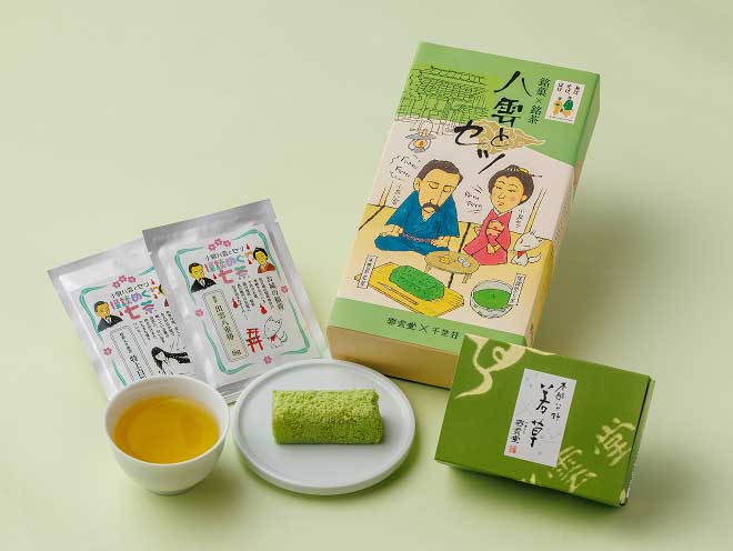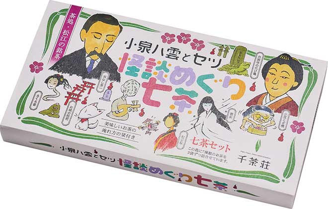彩雲堂の代表銘菓「若草」と千茶荘の怪談めぐり茶2種の詰合せです。八雲とセツが怪談を伝える際の団らんをイメージして、オリジナル詰合せを作りました。 -