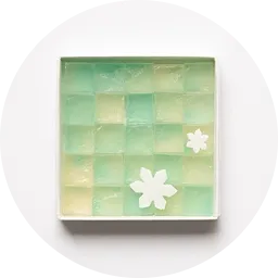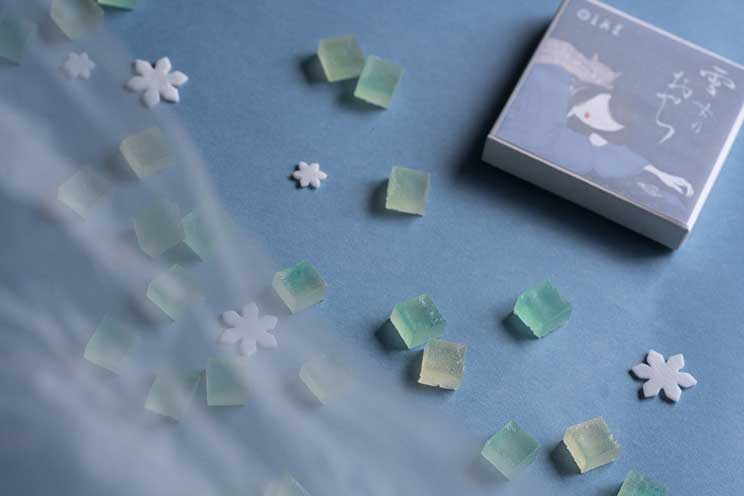怪談『雪女』に着想を得た和のスイーツ。島根県産・出西生姜の爽やかな香りと、氷を思わせるシャリッとした食感の琥珀糖。青く透き通るその姿は、まるで儚く消えた雪女の面影のよう。雪女が氷を食べる様子をイメージし、シャリとした食感が楽しめる琥珀糖を採用。氷のような輝きと、凍てつく空気を思わせる淡いブルーの美しい色合いに仕上げ、味わいには島根特産の出西生姜を使用しました。 -