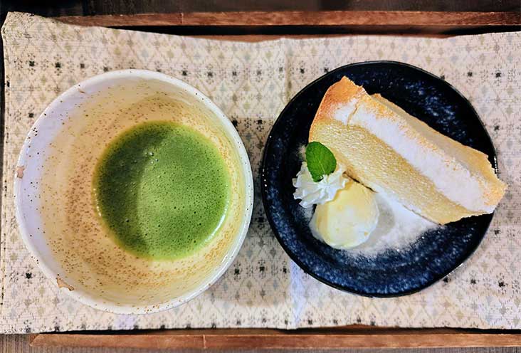 セツの語った「雪女」をイメージしたシフォンケーキです。粉砂糖を雪に見立てたっぷりまぶしました。お抹茶とシフォンケーキのセット・バニラアイス添え島根県産米粉を用いたふわふわの食感が特徴のシフォンケーキです。雪に見立てた粉砂糖が溶けないうちに召し上がっていただきたい、賞味期限の短い一品です。